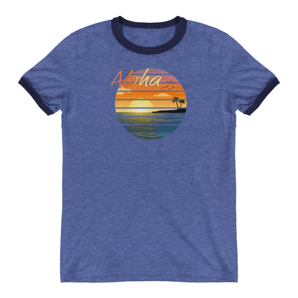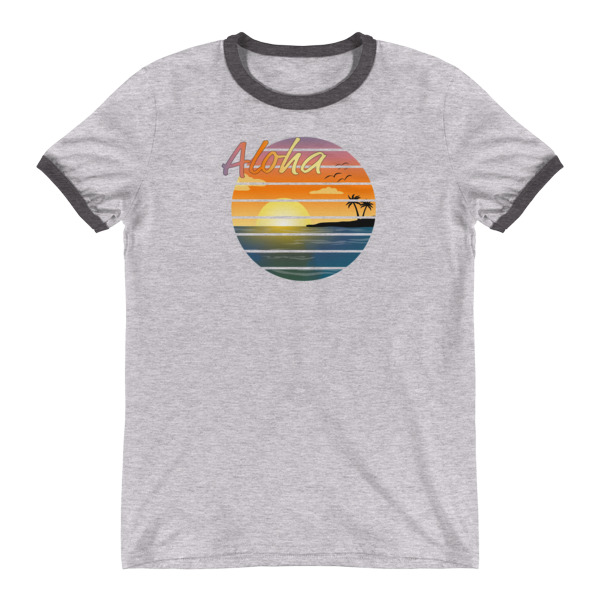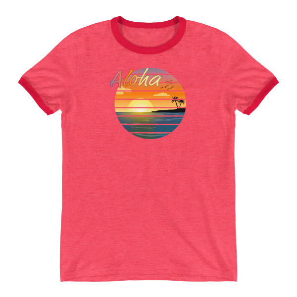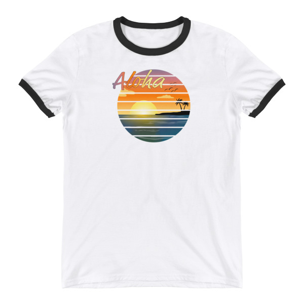 The iconic ringer t-shirt is back featuring a retro graphic design of a sunset with palm trees in the distance. If you love beaches, maybe taking a Hawaiian family vacation or summer trip to California, this is the perfect shirt to wear. Great gift for the family summer beach vacation. Men, women, and kids will say Aloha! They will love this tropical, vintage-looking, retro style shirt showing the sun setting over the ocean.
