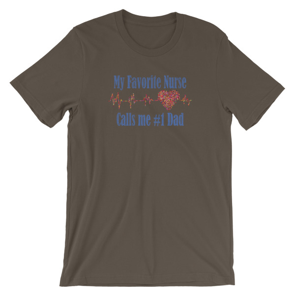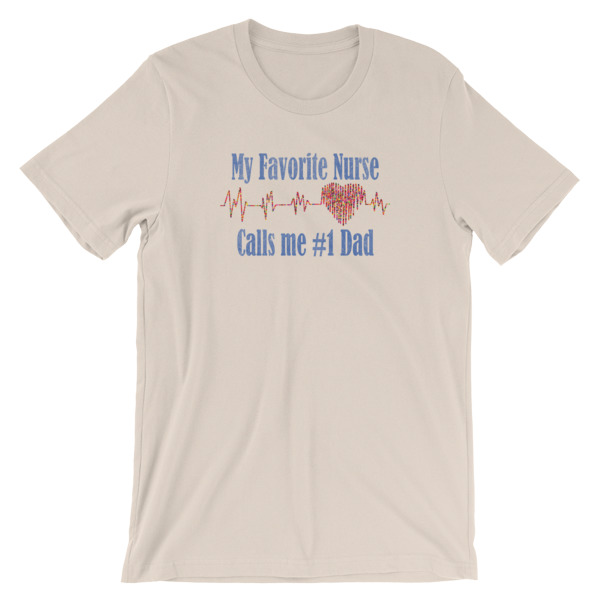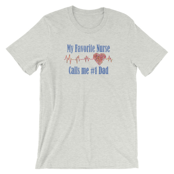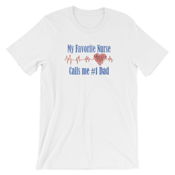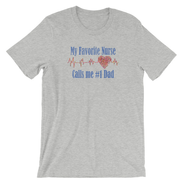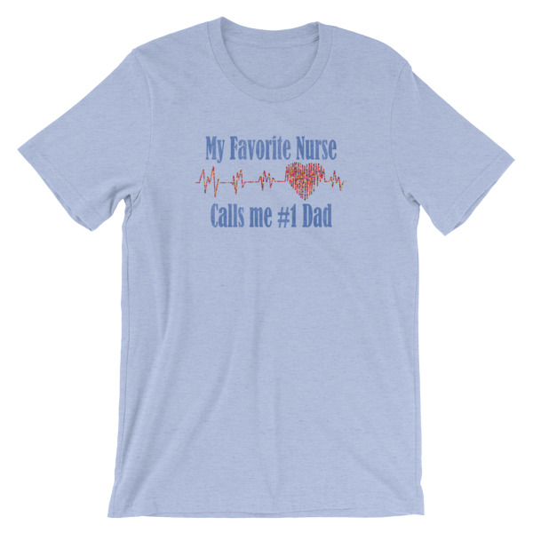 This is a great nurse’s dad shirt featuring a cardiogram with a heart and the phrase, “My Favorite Nurse Calls Me #1 Dad”. The text has a distressed look. It’s available in 12 colors in sizes S – 4X. Makes a great gift for Father’s Day or dad’s birthday. It’s comfortable and sure to be a regular favorite.