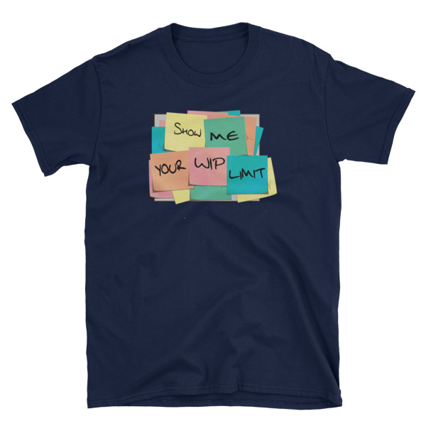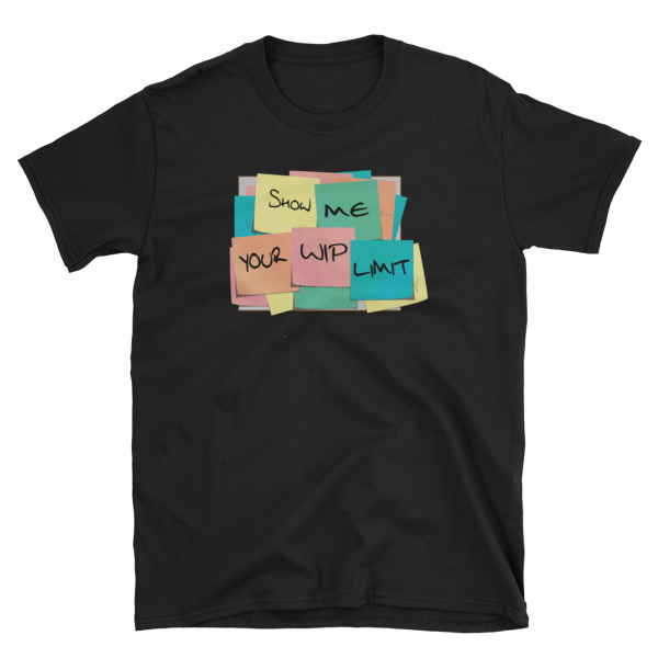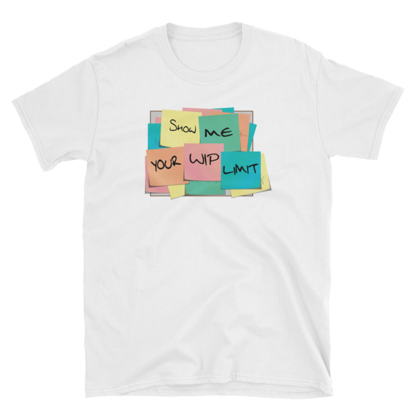This is a funny Agile shirt for those who use Kanban or Scrumban. It shows a whiteboard filled with realistic sticky notes saying “Show Me Your WIP Limit”. Makes a great gift for DevOps managers and team members.